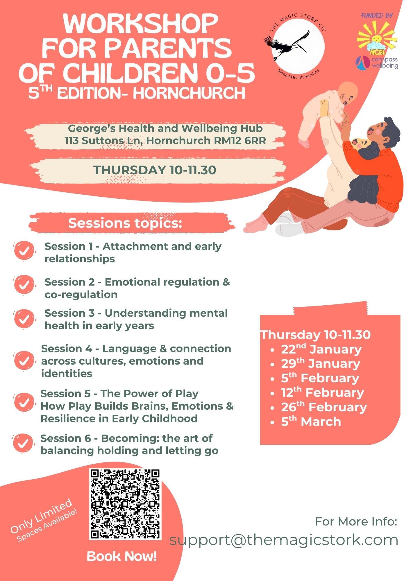 - Notes: Book your free space here: https://parentsworkshophornchurch.eventbrite.co.uk You can come with your children, we will have toys and a big mat to keep them entertained